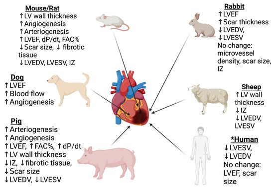 Matrigel, a collagen-based hydrogel, improved LVEF (left ventricular ejection fraction), LV peak rate of pressure, and LV pressure decline, maintained LV wall thickness, and increased capillary density in the infarct BZ (border zone), demonstrating improved contractility and recovery after ejection as well as improved angiogenesis post-MI in rodents [91].
