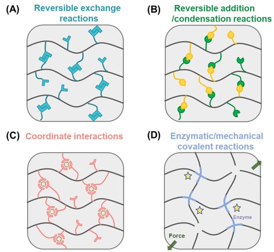 - Chakma, P.; Konkolewicz, D. Dynamic Covalent Bonds in Polymeric Materials. Angew. Chem. Int. Ed. Engl. 2019, 58, 9682–9695. [Google Scholar] [CrossRef]