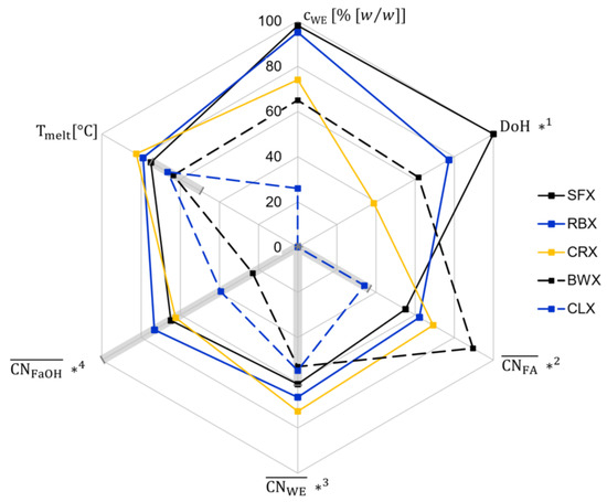 Characteristic parameters of different natural waxes: melting temperature (Tmelt), total wax ester (WE) content (% [w/w]), degree of homogeneity (DoH), mean total carbon number (CN) of the WE fraction, mean CN of the fatty acid (FA) and fatty alcohol (FaOH) moieties in the WE fraction. Span of axis from center to outer: *1: DoH from 0.23 to 14.27; *2: CNFA from 14 to 24; *3: CNWE from 30 to 56; *4: CNFaOH from 16 to 32. Gray areas: range covered by the WE studied. SFX = sunflower wax, RBX = rice bran wax, CRX = carnauba wax, BWX = beeswax, CLX = candelilla wax.