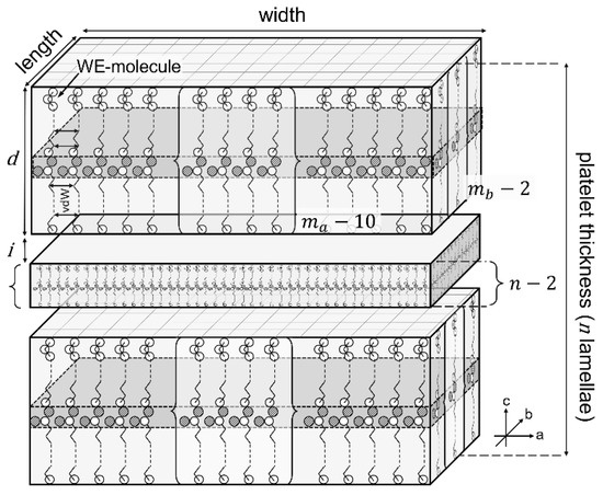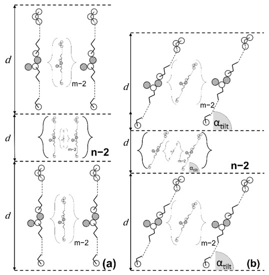 These thickness values and layer thickness values calculated based on earlier publications [9,42] were used to derive the number of molecular layers. This resulted in 80 to 100 molecular WE layers for the orthogonal chain arrangement (Figure 6a) and 90 to 112 molecular WE layers assuming a tilted chain arrangement (Figure 6b).