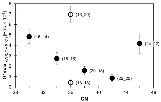 All oleogel systems were studied within their linear viscoelastic range (LVR). This was ensured using a prior amplitude strain test. (Data not shown.) The maximum complex shear modulus () was determined after 30 min crystallization time at 5 °C. The values which were determined are shown as a function of CN in Figure 3. In addition, with the molar dosage, , in general, decreased with increasing CN. This confirms the earlier findings which were based on dosage on an equal weight basis [9,27]. Within the homologous series, , the relationship between and CN appeared to be linear in the range from CN 30 to CN 42. decreased from 4.82 × 106 Pas (CN 30 (16_14)) to 8.39 × 105 Pas (CN 42 (22_20)).