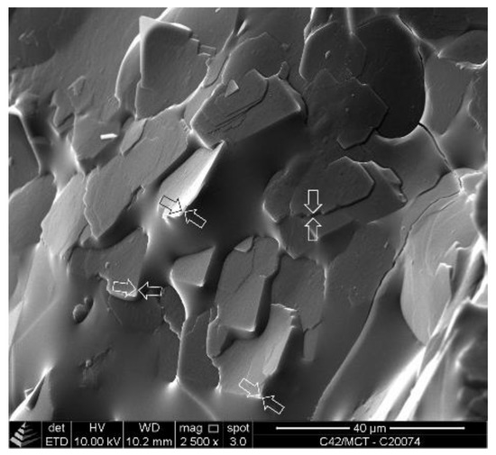 SEM micrograph of oleogel containing MCT oil and 10% [w/w] of WE CN 42 (22_20) (2500× magnification). Arrows: measuring positions for the determination of the crystal thickness.