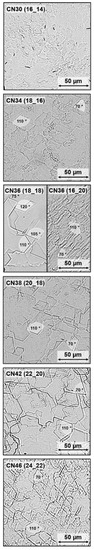 The BFM images of oleogel samples containing MCT oil and 10% [m/m] of a single WE of different CNs are given in Figure 7. The WE with the lowest CN (CN 30 (16_14)) is on top, and the WE with the highest CN (CN 46 (24_22)) is at the bottom. Herein, the platelet-like morphology visible in the cryo-SEM images is confirmed. Closer examination reveals that crystal size and pronunciation of the well-defined habit increase with CN. Accordingly, the microstructure of WE CN 30 (16_14) has a low regularity, not revealing defined angles or long straight edges. The usually rhombic morphology cannot be identified. Only for this WE, needle-like crystal structures, as described for SFX–oleogels, are discernible. Conversely, all larger WE develop crystals with longer crystal faces and appear as fused rhombic structures. Consistent with the cryo-SEM images, the angles of WE CN 42 (22_20) are found to be 110° and 70°. Most other WE show essentially the same angles. Within the WE with CN 36, remarkably different microstructures are observed. The symmetric WE CN 36 (18_18) exhibits large platelets. Here, in addition to 110° and 70°, other obtuse angles such as 120° and 105° were also found. In contrast, the WE CN 36 (16_20) exhibits shorter crystal faces and a much less regular morphology. The angles identified are again 110° and 70°.