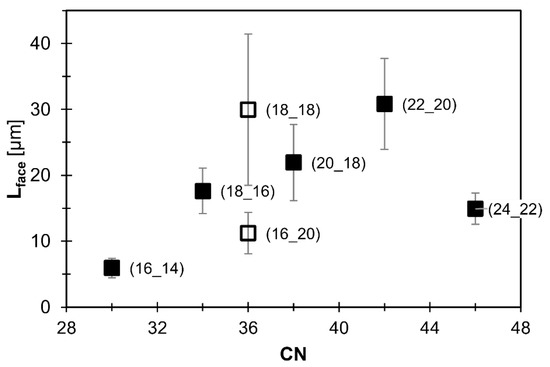 The relationship of the determined face length and the respective CN is illustrated by Figure 8. The pattern found is qualitatively inverted to that shown and described in Figure 3. Again, the homologous series from WE CN 30 (16_14) to WE CN 42 (22_20) suggests a linear relationship. Along this line, the face length increases by a factor of five. Analogous to Figure 3, the longest WE CN 46 [22_24] deviates from this pattern, showing significantly shorter face lengths than the correlation would suggest. Likewise, the data on the face length emphasize that the symmetry () of a WE is of utmost importance. As visible in the micrographs (Figure 7), WE CN 36 (16_20) has much shorter face lengths than CN 36 (18_18).