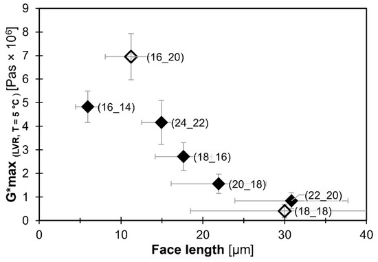 The simplest attempt to correlate characteristic parameters on the microstructure and the viscoelastic behavior is presented in Figure 9. The figure reveals a surprisingly strong relationship. Except for the oleogel based on WE C36 (16_20), the data suggest a linear dependency of the on the face length. Obviously, this simple relationship is rather an artifact from scaling the face length to the internal surface and more precisely, to rheological properties. Anyhow, this finding indicates that the interaction of the crystals in the three-dimensional network structure does not change with the CN of WE. Accordingly, it is reasonable to assume that the variation in structure efficiency for different WE is primarily in their crystal size. The two WE with equal CN but different symmetry, CN 36 (18_18)(18_18) and CN 36 (16_20), are already distinguished by a different microstructural appearance (Figure 7). Anyhow, the data for these respective oleogels adhere to the relationship displayed in Figure 9. This documents the importance of the planar extension of WE platelets for the gelling ability of WE.