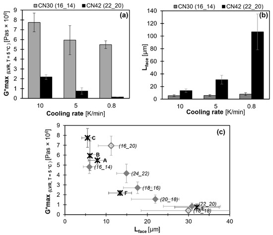 Figure 11a illustrates that the values of the oleogels increase with an increasing cooling rate. The maximum crystal face length in the respective oleogels also systematically changes, as illustrated by Figure 11b. These data are in line with expectations based on generally acknowledged crystallization kinetics, e.g., for wax-based oleogels [24,25]. They confirm that smaller crystals in compositionally equal systems typically yield more rigid gels. Figure 11c is an extension of Figure 9 and illustrates that WE oleogels produced at different cooling rates adhere to the relationship displayed in Figure 9: smaller crystals yield more rigid gels. It emphasizes the validity of the relationship found between face length and , irrespective of WE-type and cooling rate.