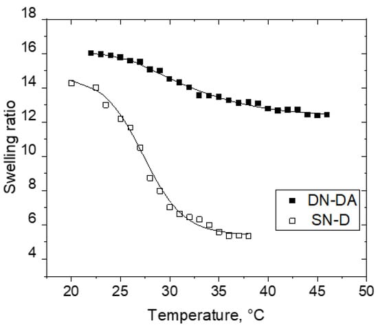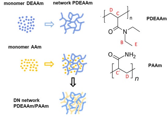 - Hanyková, L.; Spěváček, J.; Radecki, M.; Zhigunov, A.; Kouřilová, H.; Sedláková, Z. Phase transition in hydrogels of thermoresponsive semi-interpenetrating and interpenetrating networks of poly(N,N-diethylacrylamide) and polyacrylamide. Eur. Polym. J. 2016, 85, 1–13. [Google Scholar] [CrossRef]