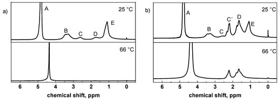 - Hanyková, L.; Spěváček, J.; Ilavský, M. 1H NMR study of thermotropic phase transition of linear and crosslinked poly(vinyl methyl ether) in D2O. Polymer 2001, 42, 8607–8612. [Google Scholar] [CrossRef]