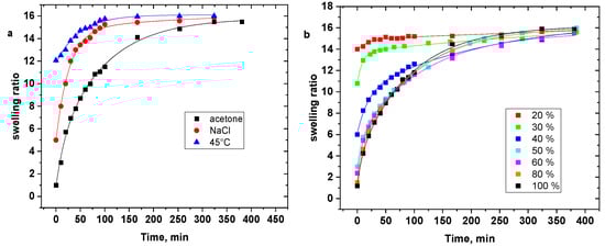 - Ceylan, D.; Ozmen, M.M.; Okay, O. Swelling–deswelling kinetics of ionic poly(acrylamide) hydrogels and cryogels. J. Appl. Polym. Sci. 2006, 99, 319–325. [Google Scholar] [CrossRef]