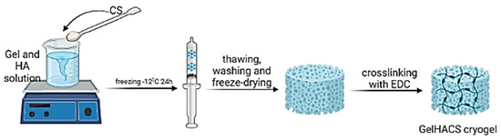 - Chang, K.-H.; Liao, H.-T.; Chen, J.-P. Preparation and Characterization of Gelatin/Hyaluronic Acid Cryogels for Adipose Tissue Engineering: In Vitro and In Vivo Studies. Acta Biomater. 2013, 9, 9012–9026. [Google Scholar] [CrossRef] [PubMed]