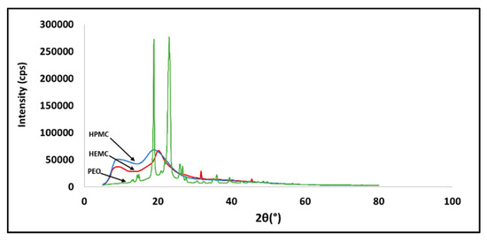 X-ray powder diffraction (XRD) patterns of the three raw polymers are shown in Figure 1. HEMC was found to have a semi-crystalline structure, HPMC was totally amorphous, and PEO was completely crystalline. The XRD pattern of PEO showed two high intensity diffraction peaks at 19.36° and 23.72°, which were assigned to the (120) and (112) planes, respectively [56]. While this information was interesting, it is provided here for information only and as a form of characterization of the raw material, since, once infused with water, all three gel types were amorphous.