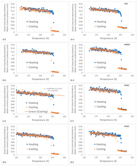 The energy-resolved “elastic” intensity scans provide insights into the gel-water structure and dynamics. As expected, a phase transition for the freezing of water was observed for all samples between 263–271 K and was characterized as an abrupt change in elastic intensity as the scattering centers became effectively immobile. Further cooling resulted in a continuous and monotonic increase in elastic intensity with decreasing temperature for all materials, as shown for HEMC in Figure 7c.l. Upon heating all samples demonstrated melting, indicated by an abrupt decrease in elastic intensity at about 275 K, i.e., near the melting point of water, 273.15 K.