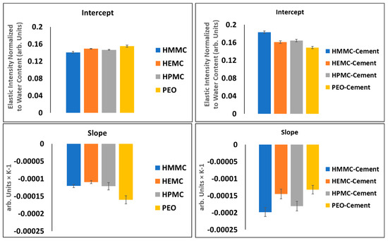 For clarity, the “elastic” intensity data for each hydrogel was plotted separately; all the individual figures are shown, refer to Figure 7 which presents the plots of normalized elastic intensity as a function of temperature for the entire 4 mass % gel series, including PEO, HMMC, HEMC and HPMC. The linear region of the cooling section was fit with a straight line, as shown on Figure 7c.l as an example. The slope and intercept and respective standard errors were obtained. The resulting values are compared in the form of bar charts, refer to Figure 9. This data provides information about the structural characteristics of the gel and pastes, albeit in the frozen state. The intercept is a measure of the amount of “elastic” scattering, i.e., the intensity of “elastically” scattered neutrons. The higher the intensity, the greater the number of “elastic” scattering sites. In this case, the majority of the elastic scattering came from the frozen water. For gels, the amount of frozen water was nominally constant, gel-to-gel, since the water content of the gels was constant at 4 mass %. Furthermore, the elastic intensity had been normalized to water content. Thus, the intercept data, which for the neat gels indicated little or no variation with polymer type, said little about the effect of the polymer on the number of elastic scattering sites.
