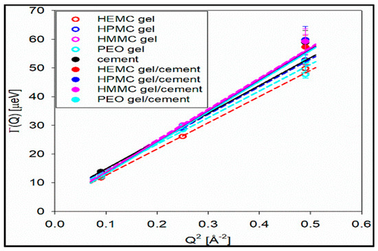 Table 1 shows the diffusivities and the “elastic”, or “settled”, water fractions for the cement and gel-cement samples. Hydroxy methyl methyl cellulose (HMMC) was included in the series, expanding the study to four gels, to provide a more complete description of how properties change with the cellulose derivative moiety. The half-width at half-maxima of the S(Q, E) spectra obtained from the model fit [72,73,74] shows a strong Q -dependence, refer to Figure 10, confirming a long-range translational diffusion process for water molecules in the samples. It was evident that there was an increase in the Γ for the gel-cement pastes compared to that of the neat gels. From Table 1, it is clear that the diffusion coefficient of water molecules in HMMC gel was greater than for the other three gels. However, the water diffusivity was almost the same for pastes, and independent of gel type. It was notable that the water diffusivity in the cement paste was lower than in gel-cement-based hydrogel pastes. This might be attributed to the hydration effect. As is shown in Figure 11, the gel-forming polymers used in this study had a complex effect on hydration. It was notable that HEMC both slowed the rate of hydration and delayed the onset of rapid hydration. For the neat cement paste, the rate of diffusivity of water was slightly lower, which might have been due to the higher extent of hydration of the neat cement, again refer to Figure 11. From Table 1, the elastic signal fraction of neat cement was somewhat higher than cement-based hydrogel pastes, which might be evidence that neat cement was more hydrated and, thus, the observed water diffusivity was lower.