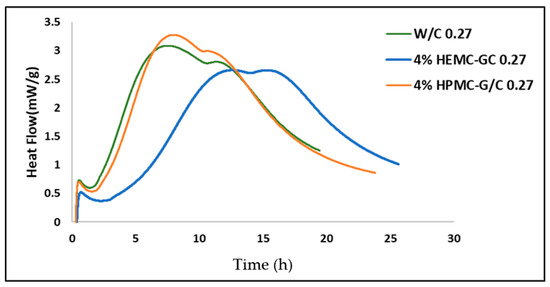 Hydration Calorimetry results for neat cement and gel-cement pastes containing 4 mass % HEMC and HEMC at a gel/cement ratio of 0.27.
