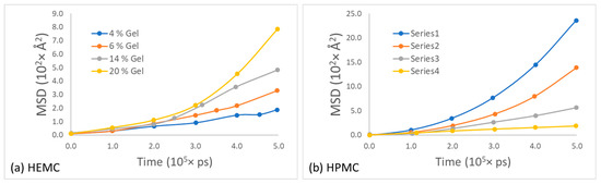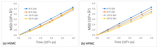 To obtain the self-diffusivity of water at different concentrations, the mean squared displacement of the center of mass of water molecules in HEMC and HPMC gels was plotted as a function of time and parametrically as a function of gel polymer mass percentage, refer to Figure 14. For both polymers, the mobility of water decreased with an increase in polymer concentration, as expected. However, the drop in the mobility of water in HEMC was larger than that in HPMC. This was consistent with the gel rheology experiments that showed a higher viscosity for HEMC.