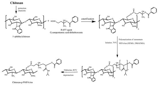 22]. By incorporating synthetic polymers within the natural polymer’s chains, particularly with stimuli responsive characteristics, it may lead to a more complex architecture with improved properties such as mucoadhesivity and controlled release capacity. Temperature-sensitive hydrogels are the most widely used due to their high potential for application in controlled drug release systems. Poly(N-isopropylacrylamide) (PNIPAAm) is a homopolymer network obtained by controlled polymerization of N-isopropylacrylamide (NIPAAm) monomers [