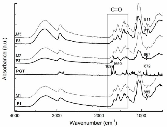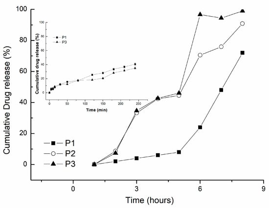 The progesterone’s specific absorption bands were identified by the presence of carbonyl (C=O) stretching band at 1650 cm−1. The characteristic band of the double bond of progesterone is generally located between 850 and 900 cm−1. For the studied hydrogels, P1, P2, and P3, the progesterone’s specific band from 870 cm−1 was determined at 911, 867, and 889 cm−1 for P3, P2, and P1, respectively. The shift to lower and/or higher vibration bands indicated the interactions between the polymeric and progesterone’s functional groups, confirming the entrapment of the drug inside the network of the copolymer.