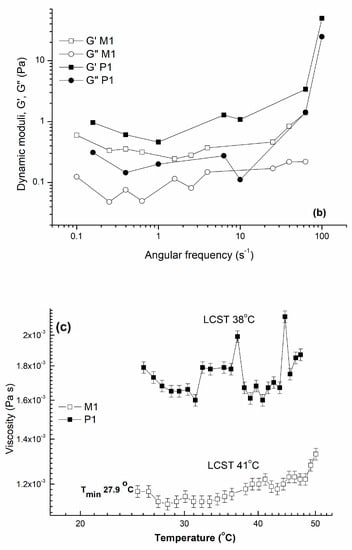 Figure 3a, the flow behavior of a selected formulations (M1 and P1) is represented, particularly CS-g-PNIPAAm/PVA 80/20 and CS-g-PNIPAAm/PVA 80/20-PGT.