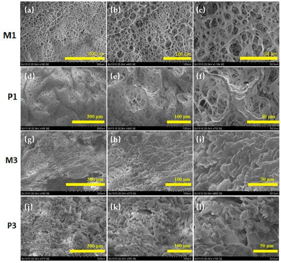 Figure 4c,i, it was confirmed that the higher the crosslinking agent, the denser the structure obtained. With the incorporation of progesterone, a less porous morphology was observed (
