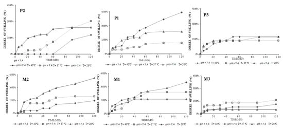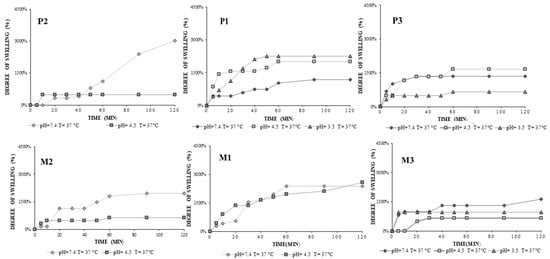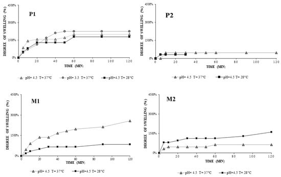 The swelling ability of the hydrogels loaded (P series) and unloaded (M series) was analyzed and the swelling degrees of the hydrogels were determined. The swelling profile of the hydrogels is represented in
