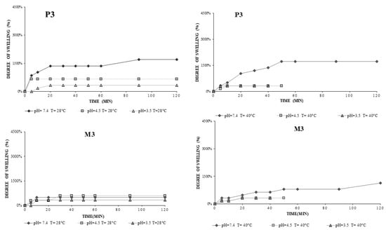 Figure 7). At 28 °C, P3 and M3 reached equilibrium swelling within the first 10 min. The pH value significantly influences Q, which is influenced by deprotonation of chitosan once the pH increases but also by electrostatic repulsion between molecules [