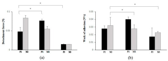 40]. The bioadhesion ratio of hydrogels in acidic media showed promising results; P1 shows higher adhesion properties compared to P2 and P3 due to the higher content of polymeric matrix and thus increased number of functional groups which can adhere to the substrate. The presence of drug within the polymeric matrix seemed to have had effect on the adhesion parameters. By balancing the amount of crosslinking together with the drugs’ molecules, it may be obtained a synergic contribution to higher mechanical parameters. Too high amount of crosslinking agent would make a matrix denser (M3), with drug (P3) ununiformly distributed resulting in a formulation with lower adhesion to the substrate. M2 and P2 by comparison had higher polymeric amount and a degree of crosslinking weaker; the polymeric matrix without drug M2 had a good adherence while the matrix with progesterone (P2) showed lower values with the respect to the detachment forces; progesterone seemed to hinder the matrix characteristics. For the propose of reducing the uterine contractility and to support the luteal phase for in vitro fertilization, higher values of the detachment forces and the work of adhesions are needed and the material P1 would be a good candidate for application.
