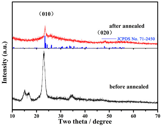 Figure 1 shows the XRD patterns of the WO3-x@-regenerated cellulose fiber composites. As known from the Debye–Scherrer equation, the broad diffraction peaks in the black line revealed the small nanoparticle size of the tungsten oxides. This was caused by the confinement of the regenerated cellulose fiber during the tungsten-oxide crystal growth process. As we can see in Figure 2, the size of the regenerated cellulose was hundreds of nanometers in diameter, which was composed of several nanocellulose fibers. When the alcoholysis intermediate product penetrated into the regenerated cellulose fiber, it was confined in the gaps between the cellulose fibers. Therefore, this confinement effect benefited from the gaps generated during the formation of the nanocellulose fiber in the regenerated cellulose fiber. This confinement guaranteed the small size of the tungsten-oxide crystal in the hydrolysis reaction of the alcoholysis intermediate product. This result is also evidenced by the partially enlarged TEM image shown in Figure 2b. As for the diffraction results of the annealed sample (the red line), there were only two obvious diffraction peaks, indexed to the (010) and (020) crystal face, which were well matched with JCPDS No. 71-2450. The disappearance of other diffraction peaks was caused by the oriented growth along with the <010> direction when it was annealed in an inert atmosphere. This was also seen in other reported works [22,23]. Tungsten oxide is a well-known semiconductor because of its varied crystal structure and affordability of oxygen deficiency. The WO6 octahedron as the unit of the tungsten-oxide crystal structure presented a different arrangement under different temperatures. The crystal structure of tungsten oxide has a temperature-related nature. Furthermore, when being annealed under an inert atmosphere, oxygen deficiencies can be formed at the surface of the crystal structure, which has a large impact on the crystal structure. Thus, tungsten oxide always reveals preferential growth under an inert atmosphere at high temperatures. Therefore, the appearance of two diffraction peaks of parallel crystal faces showed that the tungsten oxides were loaded into the regenerated cellulose fiber. This is also evidenced by the enlarged TEM image shown in Figure 2d.
