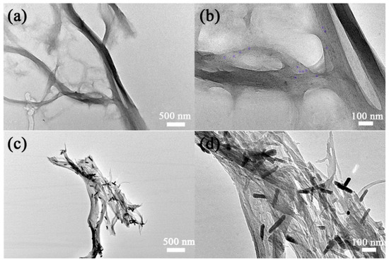 The morphology of the composite is shown in Figure 2. The morphology of the regenerated cellulose fiber with several um in length and a radius less than 100 nm can be seen in Figure 2a. This benefitted from the freezing and melting cycle process, which introduced ice crystals into the cellulose fibers to widen the distance between the fibers. This is a common way to decrease the hydrogen bonds between the cellulose fibers to induce a stable process of cellulose dispersion. As shown in the partially enlarged TEM image in Figure 2b, a large number of nanodots were anchored in the cellulose fiber. It is hard to see any small particles except in the gaps between the cellulose fibers. This result illustrates that the regenerated cellulose fiber acted as not only a growth substrate but also a confinement cage. These results were also consistent with the broad diffraction peaks of XRD diffraction shown with the black line. As shown in Figure 2c,d, these tungsten-oxide nanodots were transformed into nanorods after being annealed in a N2 atmosphere. This correlated with the XRD result of the red line diffraction pattern. Tungsten oxide prioritized growth along the <010> direction during the heat treatment under an inert atmosphere. Furthermore, the regenerated cellulose fiber was carbonized into carbon fiber during the annealing process. The carbonization process inevitably causes shrinkage, which can be seen by comparing Figure 2a,c and Figure 2b,d (taken at the same magnification). The tungsten-oxide nanodots confined in the regenerated cellulose fiber were closer and contacted each other during the cellulose shrinkage, which enabled the nanodots’ migration and the crystal’s preferential growth. The orientational growth of the tungsten-oxide nanorods was also anchored in the carbon fibers. It is difficult to see any nanorods except in the gaps between the carbon fibers (Figure 2c,d). This is very important for its practical application, which effectively prevents the loss of active material.