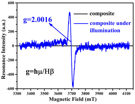 EPR spectra of the WO2.72@-regenerated cellulose composite under natural conditions (black) and illuminated by AM 1.5 (blue).