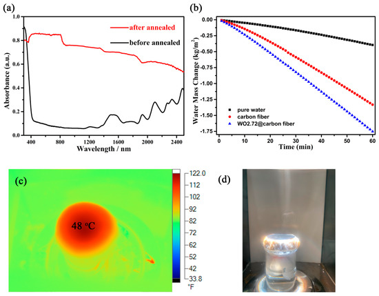 As Figure 2c,d shows, the orientational growth of the nanorods was anchored in the carbonized fiber. The nanorod morphology depressed the light scattering to a large extent. The high concentration of free carriers in the semiconductor coupled with the carbonized cellulose fiber had excellent solar absorption, as shown in Figure 5a. As is known, the amorphous carbon material only absorbs visible light, not near-infrared light. Only some graphene-based carbon materials have a small near-infrared absorption capability due to their single electron on each carbon atom. Apparently, the carbon fiber obtained in this work could not be graphitized at the low carbonization temperature without catalysts. Therefore, the good absorption between 800 and 2500 nm of the annealed product (red line) mostly came from the oxygen deficiencies in WO2.72. A new orbital energy level was introduced into the valance and conductive band when oxygen vacancies formed in the semiconductor. The collective oscillations of the surface free carriers (electron for n-type semiconductor WO2.72) induced the surface plasmon resonance, which indicated a good photothermal conversion performance. As for the cellulose before being annealed, the weak absorption in the range from 1600 to 2500 nm was due to its surface functional groups such as COOH and OH, which is a common occurrence in biomass. Therefore, a water evaporation test was conducted under one sun illumination to evaluate the photothermal conversion performance. The results are shown in Figure 5b; the water evaporation rate of the WO2.72@carbon fiber reached 1.75 kg m−2 h−1, which was faster than that of carbonized fiber and 4.4 times higher than that of pure water (0.39 kg m−2 h−1). The water evaporation efficiency of the carbonized cellulose fiber was 1.33 kg m−2 h−1, which was lower than that of the graphene-based carbon materials [24]. This was determined by its electronic structure. The free-carrier concentration of the carbon fiber was very low, which could not effectively absorb the low-frequency photons to generate heat. According to the calculation equation of light to heat for water evaporation efficiency [25], the conversion efficiency of the WO2.72@carbon fiber was 85%. This evaporation efficiency was higher than that of the reported 2D evaporators [26,27,28]. It should be mentioned that 2D evaporators aim to evaluate the photothermal conversion performance, and 3D evaporators aim to increase the water evaporation rate. Therefore, the water evaporation rate was limited by the finite evaporation surface. Here, water evaporation consumed a large amount of the heat generated by the photothermal conversion membrane to realize the phase transition; even with this, the surface temperature still reached 48 °C. Therefore, the composite of the WO2.72@carbon fiber revealed an excellent photothermal conversion performance. As shown in Figure 5d, above the evaporation surface of the WO2.72@carbon fiber membrane, the steam generation under one sun irradiation (simulated solar light irradiation, whose power was 100 mW/cm2) was clear. The dynamic evaporation process recorded by a cell phone can be seen in Supplemental Material Video S2. Therefore, the photothermal evaporation membrane fabricated with the assistance of vacuum filtration might have a promising application in the solar desalination field.