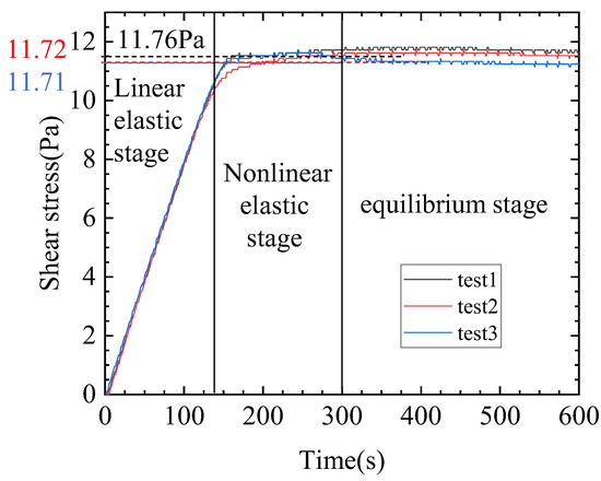 The yield stress of the gel material is obtained by directly measuring the stress–time curve, as shown in Figure 1. The three curves are in good agreement, and the average of the maximum values of the three curves is = 11.73 Pa.