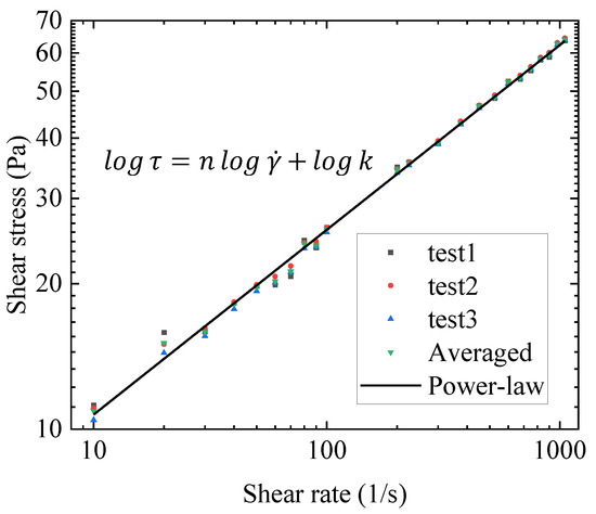 After high-speed shearing, the gel behaves as a power-law fluid, and the power-law model can be used to fit the stress–shear rate relationship. The fitting process is shown in Appendix E, and the fitting results are good.