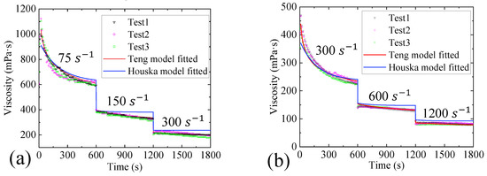 To further evaluate the predictive ability of the models, the obtained model parameters were compared with the step–shear rate curves obtained in the experiments. Since the Toorman model has a poor effect on the transient fitting of the gel, only the predictive ability of the Houska model and the Teng model is considered. In Figure 5a, the shear rates used in the step–shear rate curve are 75 , 150 and 300 . In Figure 5b, the shear rates used in the step–shear rate curve are 300 s−1, 600 and 1200 . The fitting results are shown in Figure 5.