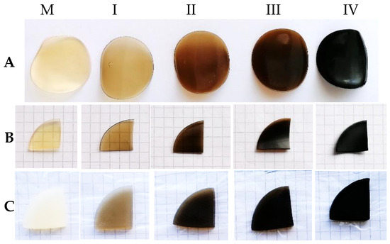 Hydrogel samples after drying in figure (A), being prepared for swelling in figure (B), and after 48 h of swelling in figure (C); I, II, III, and IV with increasing GO concentration, and the control sample M.
