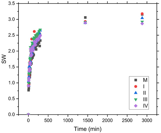 The swelling process took place by keeping the tea bags with samples in distilled water for specific time intervals (5 min in the first 2 h, then 15 min the next 3 h, and finally after 24 and 48 h), followed by weighing them after removing the excess of water with a paper towel. The weight of the dry hydrogels (W2), the wet tea bag (W1), and the swelled hydrogels (W3) can be found in the swelling degree (SW) Equation (1) [23,39,40].