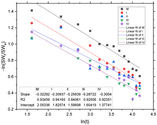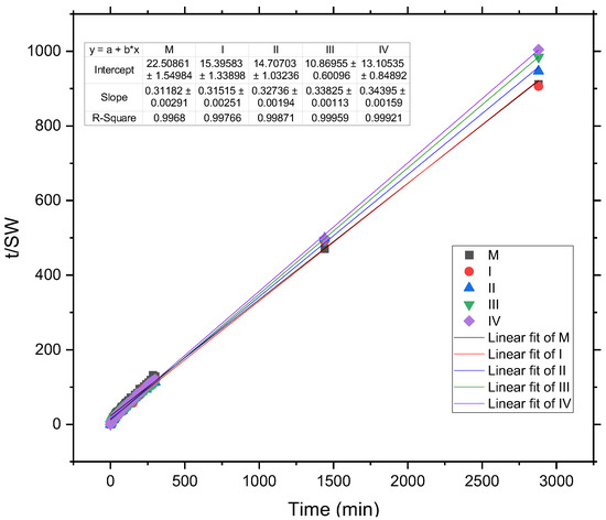 Knowing the value of the coefficient n, it can be established whether the swelling process was a first-order diffusion (n ≤ 5) or if it was a second- (n = 1.0) or third-order (0.5 < n < 1.0) non-Fickian diffusion. The plots’ linearity of Equation (4) is another way to determine if the swelling process follows the Fickian diffusion, as follows: