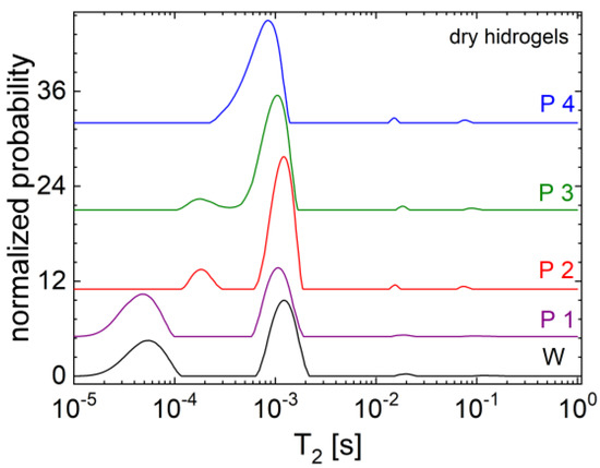 The molecular motion of water molecules throughout the polymer matrix was evaluated by measuring spin–spin 1H transverse relaxation times (T2) with a Bruker Minispec mq20 NMR spectrometer (Bruker, Karlsruhe, Germany). The T2 distributions were obtained by the inverse Laplace transform decays of the CPMG (Carr–Purcell–Meiboom–Gill), recording a total of 1000 echoes with echo times of 70 µs and 0.5 s recycle delay.
