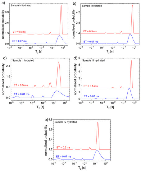 The T2 distributions of hydrated hydrogel samples; (a) control sample M, (b) sample I, (c) sample II, (d) sample III, and (e) sample IV measured for an echo time ET = 0.07 ms (blue) and ET = 0.5 ms (red).
