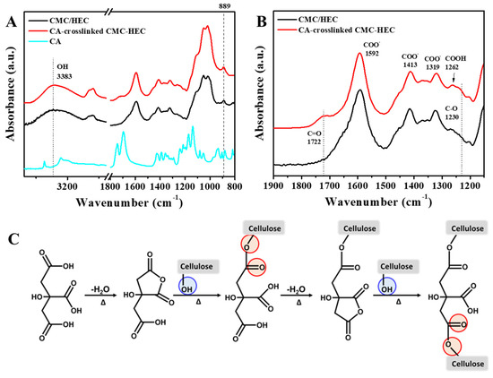 FTIR spectra of CMC/HEC, CA-crosslinked CMC–HEC, and CA in the ranges of (A) 3750–800 cm−1 and (B) 1900–1150 cm−1. (C) Scheme of the crosslinking mechanism of cellulose with CA.