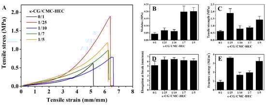 (A) Tensile stress–strain curves and (B–E) the corresponding mechanical parameters of the κ-CG/CMC–HEC hydrogels with different compositions.