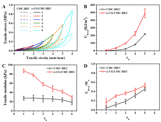 The excellent mechanical performances, particularly the high toughness, of the DN gels are closely related to the effective energy dissipation, which can be demonstrated by the hysteresis of the loading–unloading curves of the hydrogels stretched to different maximum strain (εn) values. As shown in Figure 4A, the hysteresis loops developed in the stress–strain curves were observed for both the CMC–HEC covalent single-network (SN) gel and the κ-CG/CMC–HEC DN hybrid gel. For both the SN and DN hydrogels, the (n + 1)th loading curves are always higher than the nth unloading curves, probably because of the self-recovery of the dissociated physical bonding. The energy dissipated during the nth cycle was calculated as follows [30,31]:
