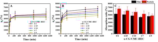 Effect of the absorption time on the water-absorption capacity of the hydrogel (A) films and (B) particles with different compositions in deionized water (pH 7) at 25 °C. (C) Effect of the κ-CG content on the maximum water-absorption capacities of the hydrogel films and particles in deionized water (pH 7) at 25 °C.