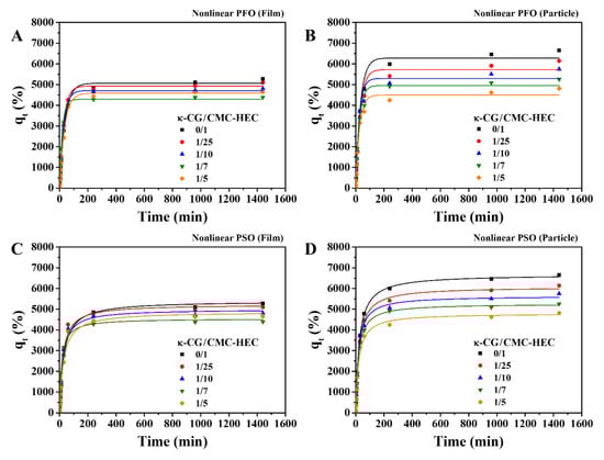 Effect of the absorption time on the water-absorption capacity of the hydrogel films and particles with different compositions in deionized water (pH 7) at 25 °C. The experimental data were fitted with the (A,B) nonlinear PFO and (C,D) PSO kinetic models.