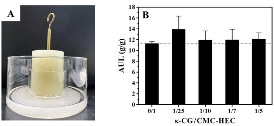 (A) Photographs of the AUL test equipment. (B) Effects of the κ-CG content on the AUL of the dried gel particles in deionized water (pH 7) at 25 °C.