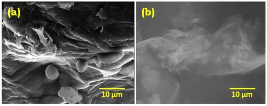 SEM images of (a) GO and (b) rGO. The contrast difference in the layered and thin transparent layer is observed for GO and rGO in the SEM micrograph, confirming the process of reduction of rGO from GO.