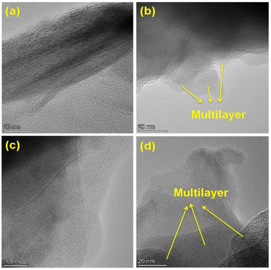 The TEM image of GO shows a highly corrugated structure. It is clearly observed from the dark shaded regions, which indicate the layered fashion of the graphene oxide layers [31]. Additionally, it can be observed from the TEM image of GO (Figure 4a,b), the slightly folded and curly edges that correspond to the attachment of the oxygen containing functional groups in the edges of the stacked graphene oxide layers. However, the TEM image showed a clean and disordered, single, multilayered structure [32]. Due to the reduction process, there is a disintegration in the orderly stacked layers of graphene oxide, resulting in a flat morphology [33]. Additionally, the reduction caused the absence of many oxygen-containing functional groups that can be observed from the TEM image of rGO (Figure 4c,d) which has almost smooth edged lattice fringes and decreased wrinkles [34].