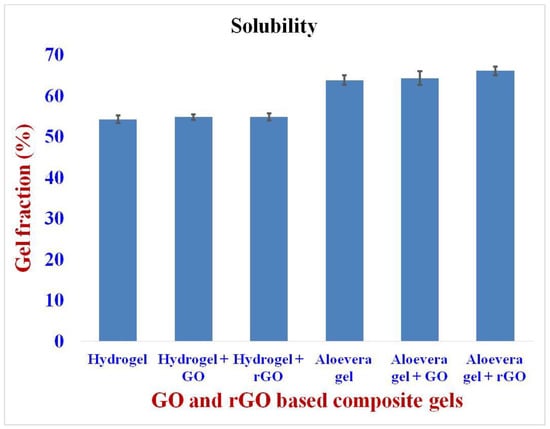 The solubility of the formulations was carried out by immersing the composite gels in de-ionized water. The carbopol hydrogel showed a lower solubility of 54% compared to that of the aloe vera gel, which showed an insoluble gel fraction of about 60% (Figure 6). Hence, it is clear that the aloe vera-based composite gels are more readily soluble than the hydrogels [40]. Additionally, from the previous literature, it is proven that the GO and rGO are readily soluble in polar and non-polar solvents, which depend upon the presence and type of functional groups in the graphene layers [43]. Henceforth, it is one of the major reasons for the enhancement in the solubility range of the composite gels used here to a greater extent.