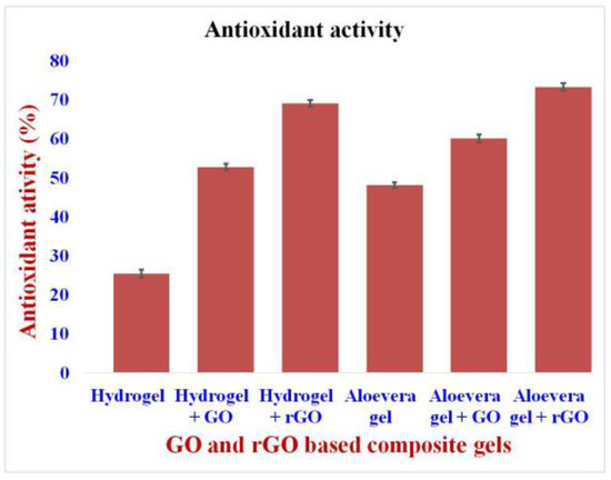 Antioxidant activity of GO and rGO-based Composite Gels. The antioxidant activity of the formulations was carried out using a DPPH assay. rGO-based hydrogel and aloe vera gel (hydrogel + rGO and aloe vera + rGO) showed a high percentage of antioxidant activity.