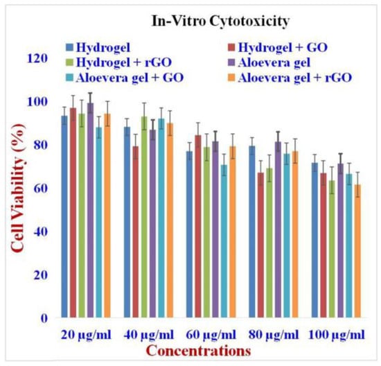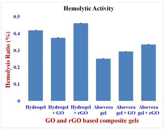 The hemolytic activity of the GO and rGO-based formulations showed an accepted hemolytic value of less than 2%. The hydrogel-based formulations showed the following hemolytic activity: Hydrogel–0.41%; hydrogel + GO–0.37%; and hydrogel + rGO–0.46%, respectively. Similarly, the aloe vera-based formulations showed a hemolytic activities of: aloe vera–0.25%; aloe vera + GO–0.29%; and aloe vera + rGO–0.33%, respectively [50] (Figure 9). From these results, it is clear that the GO and rGO are non-hemolytic, and their conjugation with hydrogel and aloe vera gel has good blood compatibility. It also shows that aloe vera is much more compatible when compared to hydrogel.